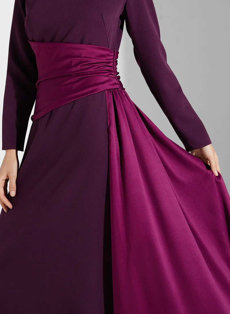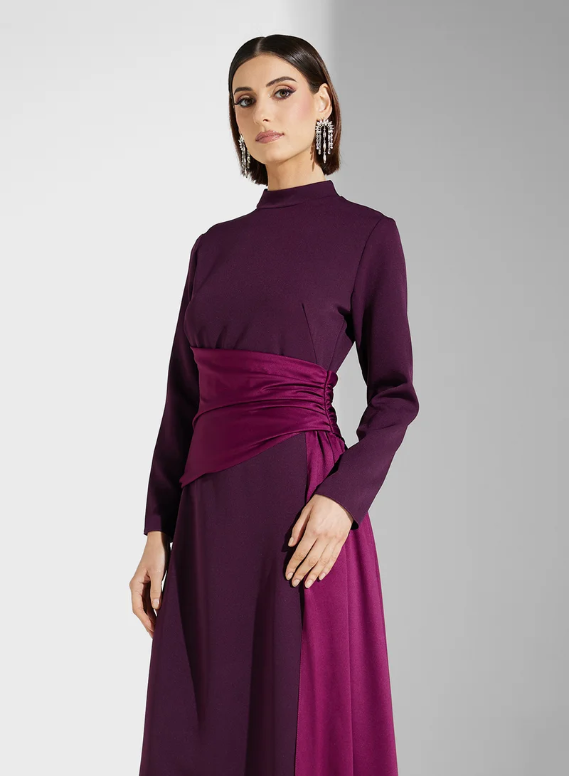 يتميز هذا الفستان الأنيق بأكمام طويلة ورقبة واسعة، وحزام خصر، وجزء ساتان جريء لإضفاء لمسة من الإثارة. الفستان مُصمم بلون أرجواني غامق.