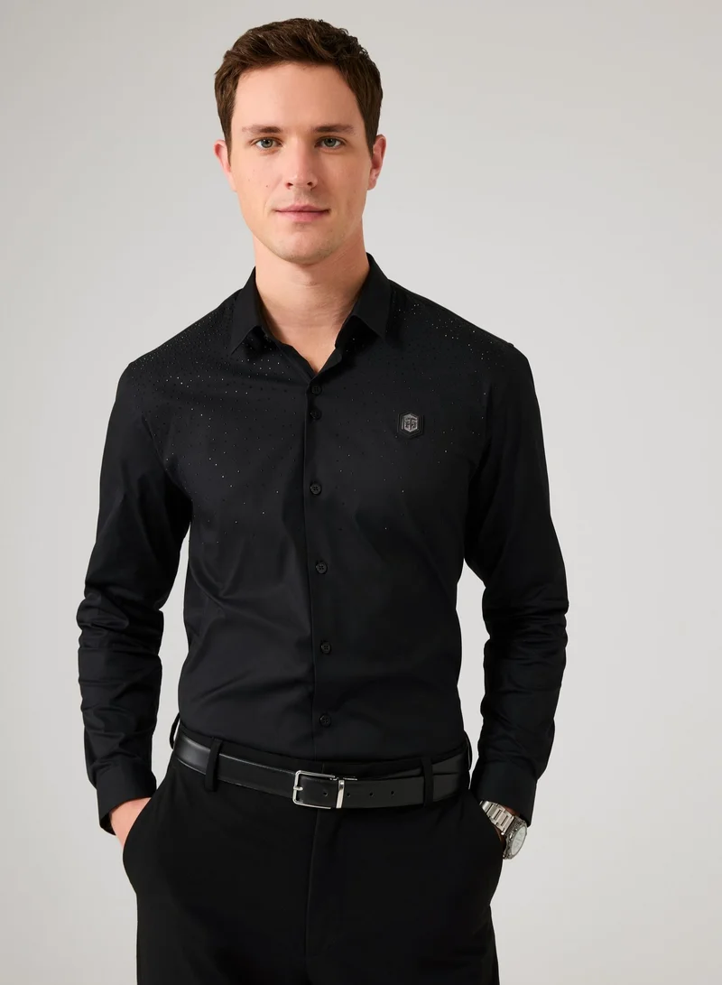 مصمم للرجل الطليعي، يتميز هذا القميص الأسود بزخارف جريئة وأزرار راقية – مثالي للاحتفال بأناقة.